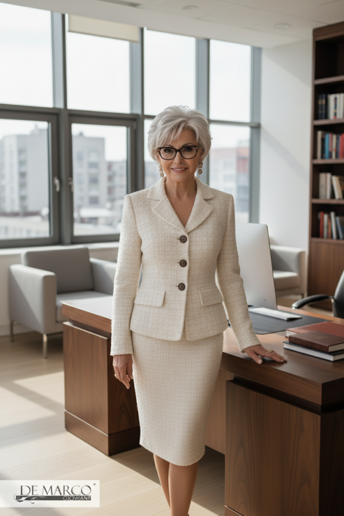 Elegancja nie zna wieku – tweedowy komplet to doskonała propozycja zarówno dla kobiet 30+, 40+, 50+, jak i 60+ czy 70+.