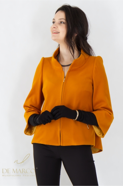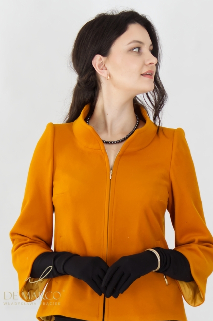 The Polish Cyrena III short coat is crafted from high-quality wool, guaranteeing excellent thermal insulation without weighing down the silhouette. Wool, a natural material, provides warmth and breathability, synonymous with luxurious comfort. It's also a fabric known for its elasticity and wrinkle resistance, ensuring the coat always looks impeccable and minimizes the need for frequent maintenance. The coat is available in a magnetic ochre color, a perfect combination of warm brown and golden mustard. This noble shade adds energy and depth, perfectly complementing the fall/winter color palette, and its intensity attracts the eye with class and sophistication.