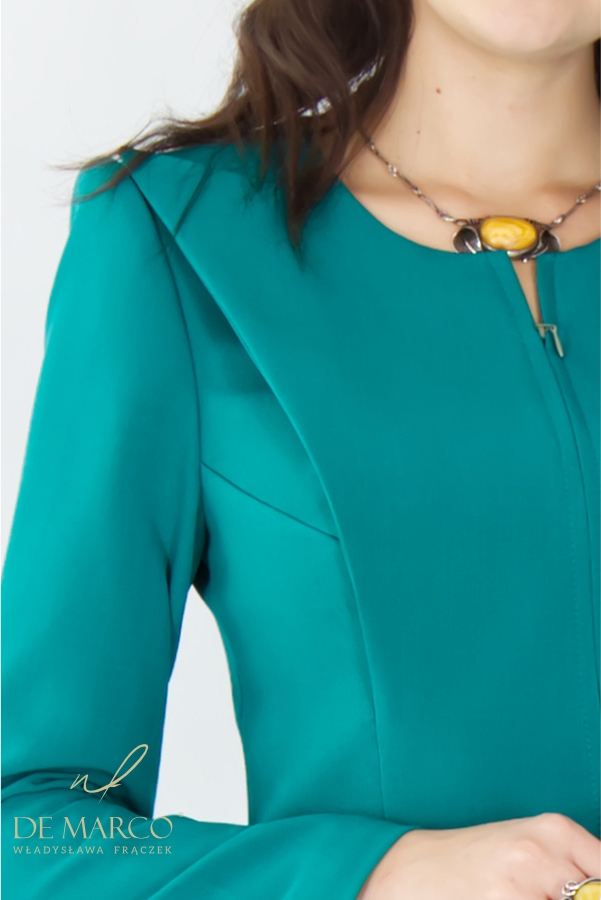 Modny i ponadczasowy garnitur damski Elizaveta to propozycja dla kobiet biznesu, przedstawicielek świata nauki, kultury i polityki, które pragną wyglądać profesjonalnie, ale z nutą artystycznej finezji. Idealny na oficjalne wystąpienia, spotkania branżowe, jubileusze czy rodzinne uroczystości – wszędzie tam, gdzie klasa i pewność siebie są równie ważne, jak komfort i elegancja.