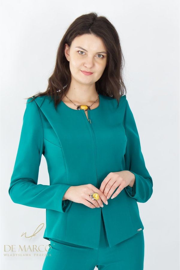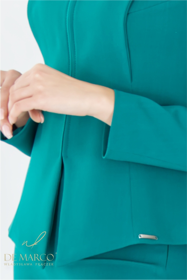 Zieleń z nutą lazuru to barwa, która łączy spokój z siłą, harmonię z ekspresją. To kolor kobiet, które nie boją się wyróżniać – mądrych, dojrzałych, ale wciąż pełnych pasji i życiowej energii. Garnitur Elizaveta marki De Marco to hołd dla takich kobiet: pewnych swojej wartości, ceniących perfekcję kroju, luksus tkaniny i niepowtarzalny styl. To klasyka w odświeżonej, pełnej światła odsłonie – nowoczesna elegancja w barwie, która przyciąga uwagę, nie tracąc nic ze swojej subtelności.