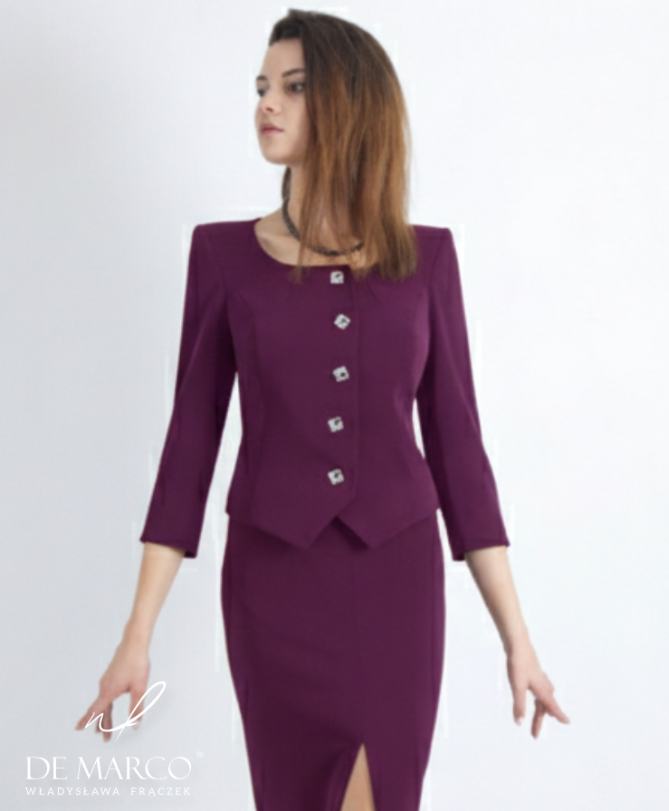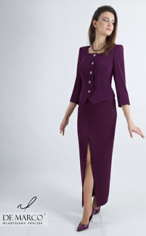 Kolor bakłażanowego fioletu to odcień szlachetny i ponadczasowy, kojarzący się z królewską wytwornością i dystynkcją. Doskonale wpisuje się w jesienno-zimowe palety barw, podkreślając elegancję i powagę okazji. Total look w jednym kolorze dodatkowo optycznie wysmukla sylwetkę i nadaje całości harmonijny, luksusowy charakter.
