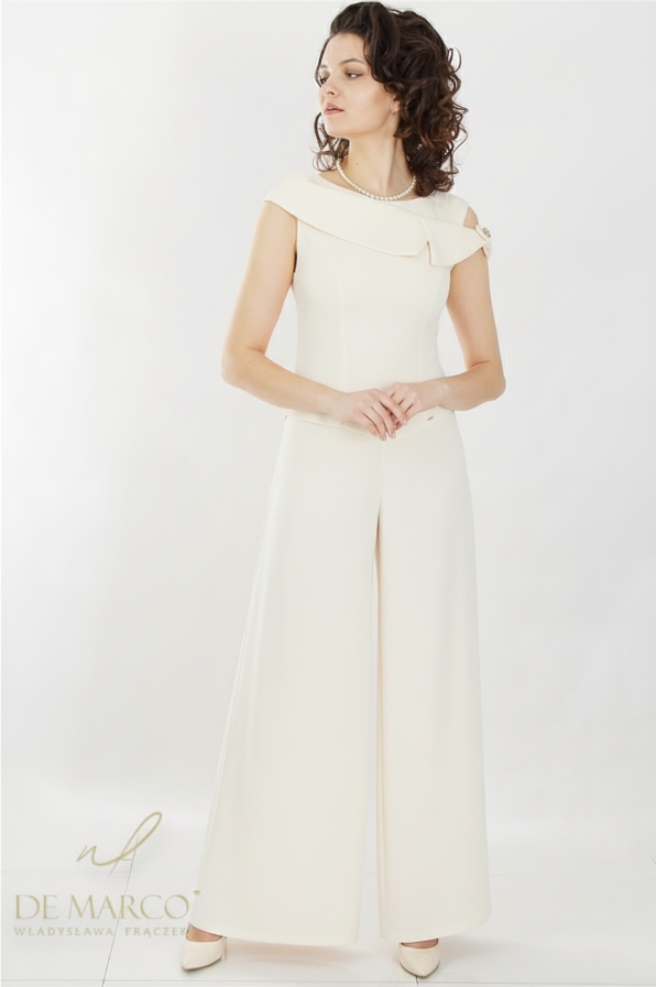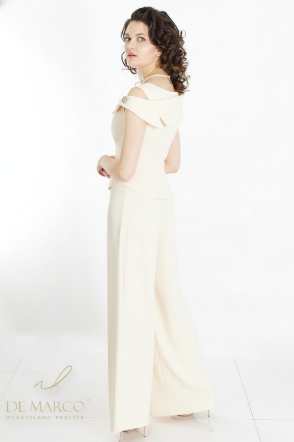 Śmietanowy komplet ze spodniami Hermina V to wyjątkowa propozycja dla kobiet ceniących wyrafinowany styl, subtelność i nowoczesną formę. Projekt autorstwa Władysławy Frączek dla Atelier De Marco łączy w sobie ponadczasową elegancję z lekkością, jaka towarzyszy najlepszym wizytowym stylizacjom. To spodnium, które nie tylko podkreśla klasę i kobiecość, ale również dodaje energii i pewności siebie – doskonale sprawdzi się zarówno podczas rodzinnych uroczystości, jak i kulturalnych spotkań, eleganckich przyjęć plenerowych czy stylowych eventów biznesowych.