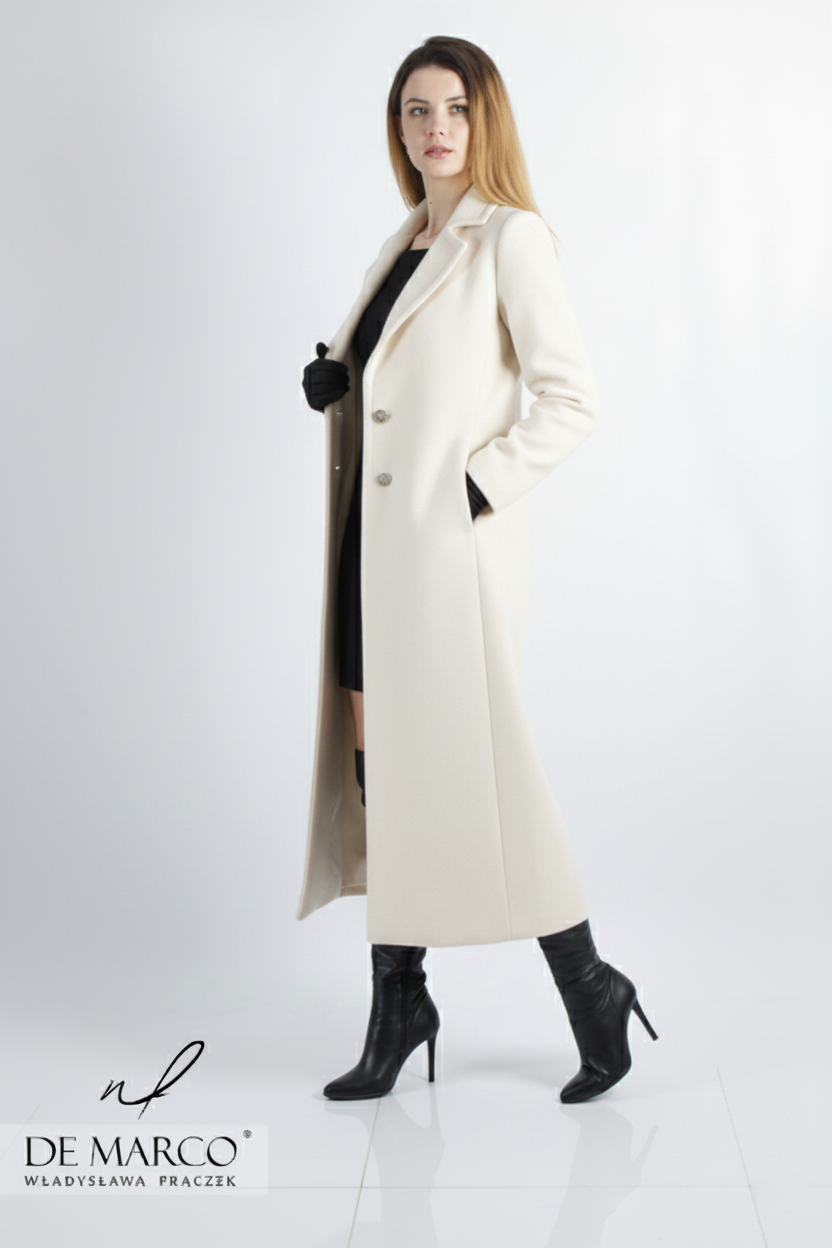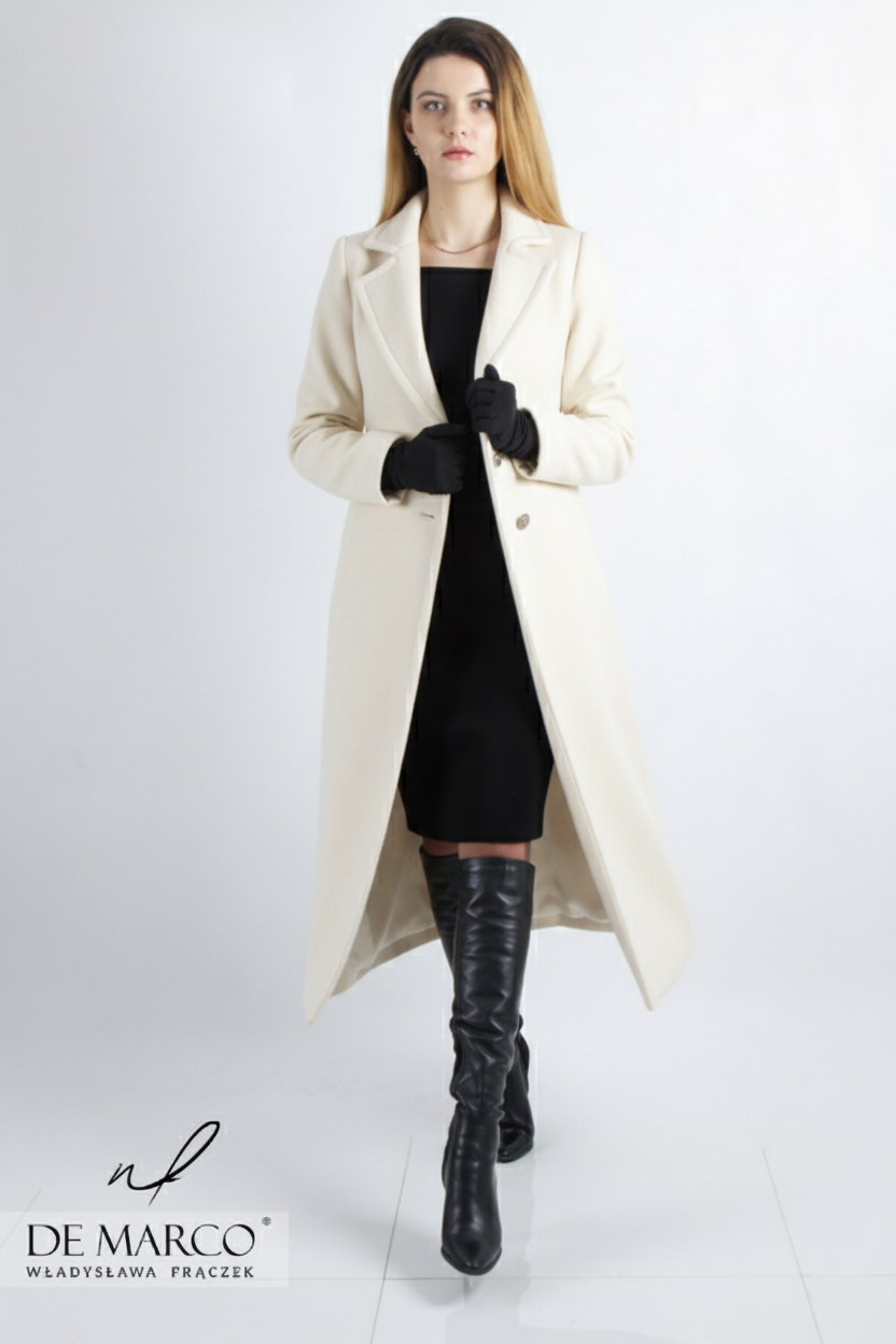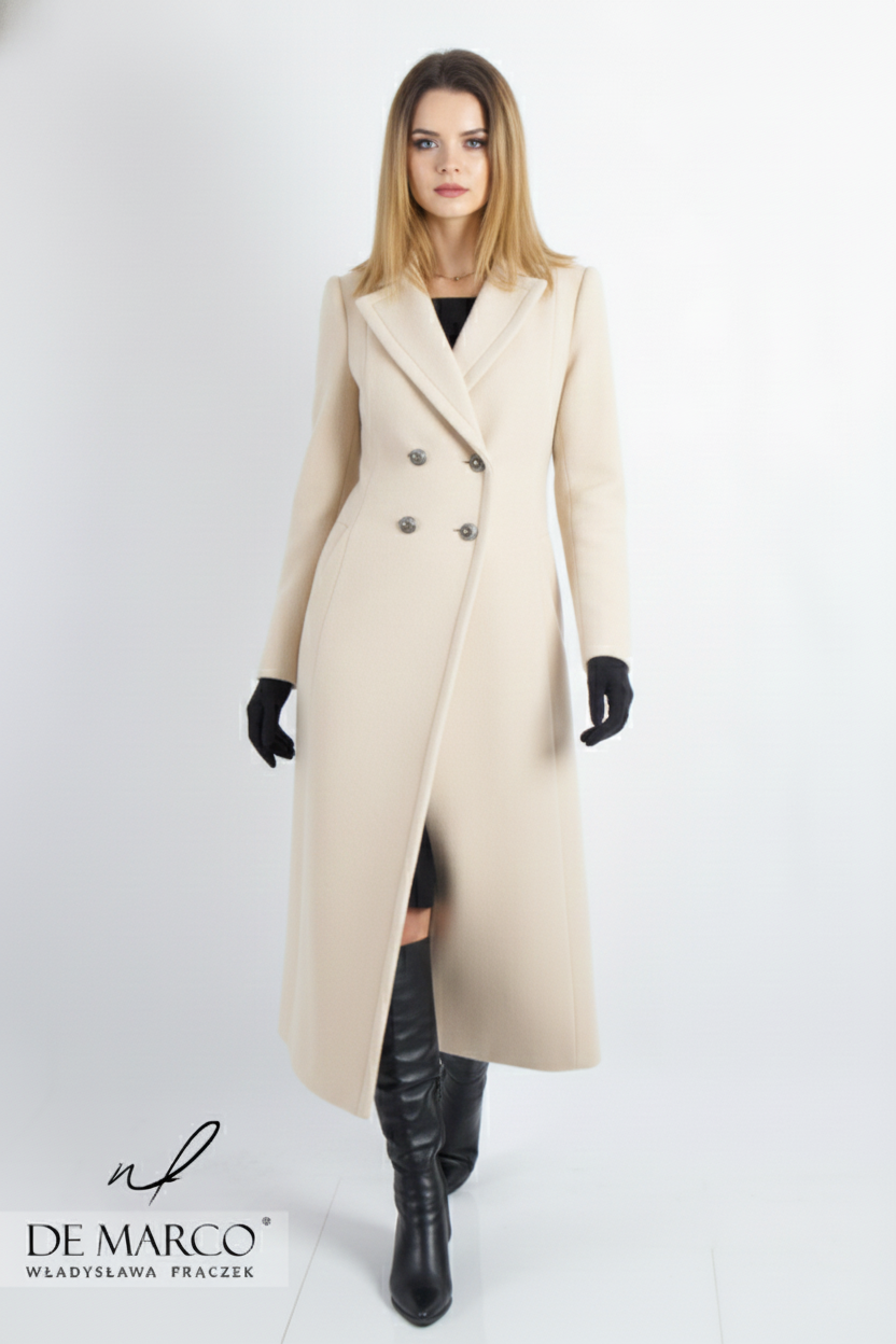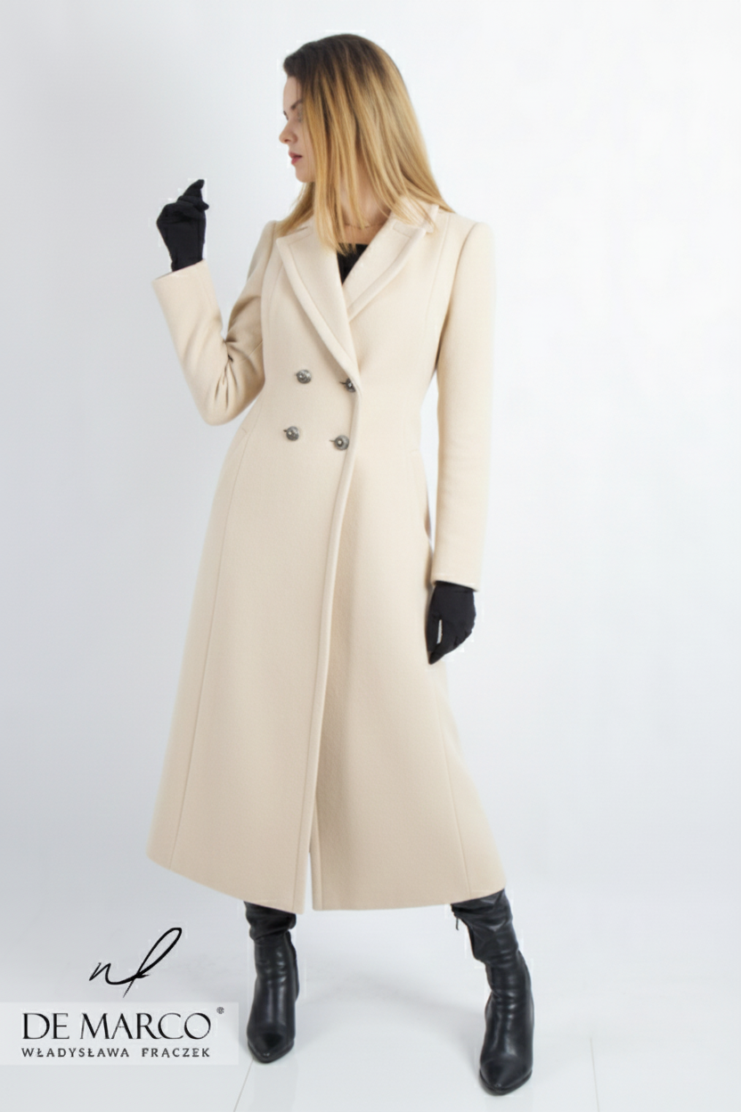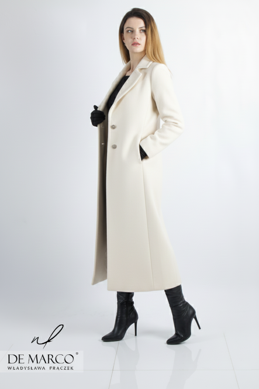 Wybór jasnych odcieni wełny na długi płaszcz to nie tylko modowy, ale i strategiczny wybór w ponurej, jesienno-zimowej aurze. Podczas gdy na zewnątrz panuje często przygnębiająca szarość, Ty wkraczasz w otoczenie, roztaczając wokół siebie blask. Jasna wełna odbija światło, sprawiając, że cera wygląda na wypoczętą, a spojrzenie zyskuje głębię – to niezwykle cenny atut, szczególnie w miesiącach, gdy nasza skóra jest zmęczona brakiem słońca. Jasne kolory, są ponadczasowe i łatwo komponują się z całą paletą barw, co czyni je uniwersalnymi i zawsze eleganckimi. Nasz szyty na miarę płaszcz damski midi w jasnym kolorze pięknie kontrastuje z ciemnym tłem, rozświetlając ponurą aurę, lub doskonale harmonizuje z zimowym krajobrazem, dodając stylizacji lekkości i świeżości.